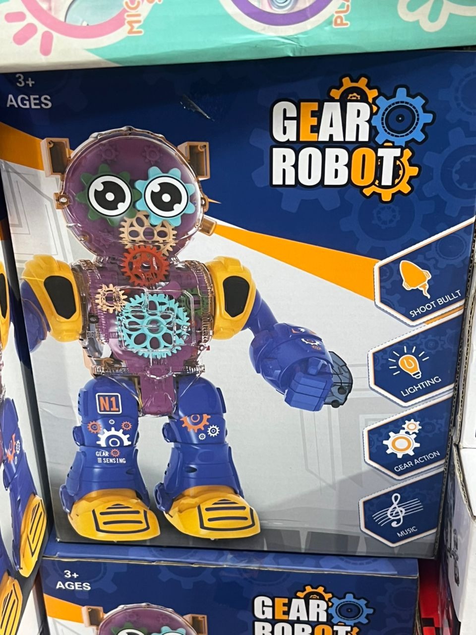 Le robot présente des engrenages internes visibles qui s’illuminent et bougent.